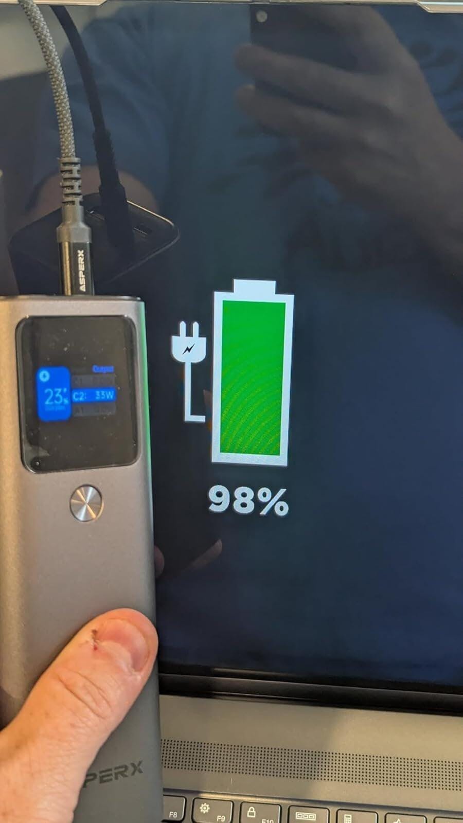 I let my computer drain all the way down to zero and then plugged this device in to see how much of a charge it would give me. My battery is 71 Wh capacity and the battery pack charged it up to 98% in about 2 hours. I thought this was quite impressive. I still had enough to do a full phone charge as well and a little bit extra.