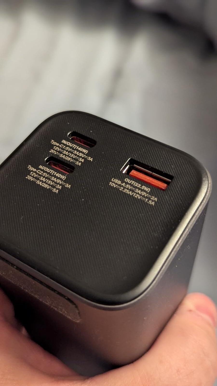The charging performance is the most important aspect, and it delivers on its claims. It successfully negotiates a full 140W power delivery profile with my laptop, providing the same charging speed as the original wall adapter. At the same time, I was able to charge my phone from the other port without a problem. It has enough capacity to fully recharge my laptop at least once, or to charge my phone many times over. The 99 watt hour rating also means it is compliant with airline carry on regulations.